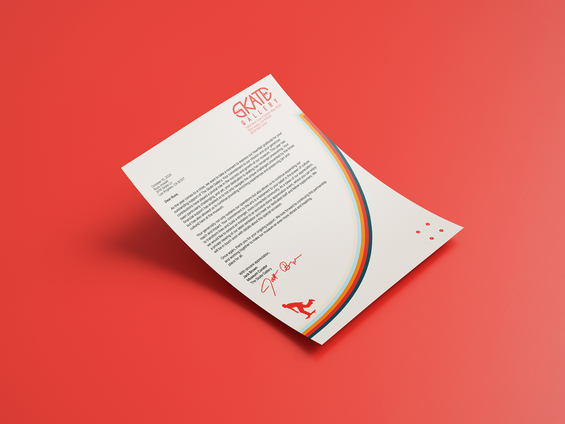 A concept for a Skateboarding Museum. I designed the logo, came up with a brand board, and created the business cards, letterhead, envelope, and skate deck.